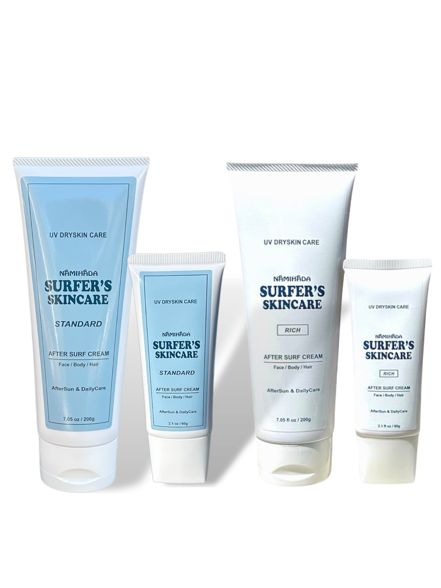 「NAMIHADAのクリームを、シーンに合わせて使い分けたい」 そんなプロ志向のニーズに応える、STANDARD(200g/60g)とRICH(200g/60g)の計4本フルセット。その日の日差しや肌の状態に合わせて、最適な「整肌」と「保湿」をカスタマイズできる究極のセットです。